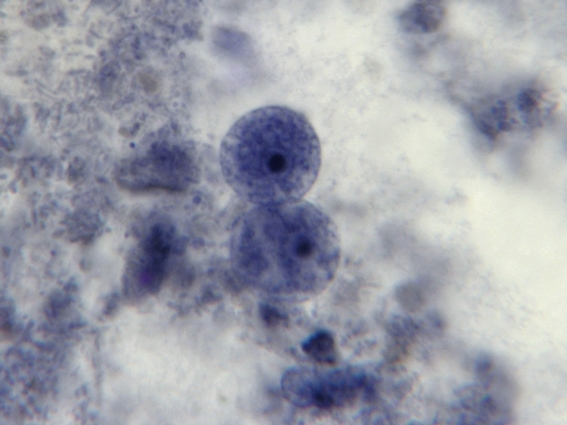I.bütschlii trophozoite - two cells. Difficult to distinguish from E.nana trophs although generally more irregular in shape and space between nuclear membrane and karyosome appears clearer with fewer chromatin granules.