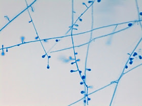 Here also you can see that the conidiophores are minimally differentiated from the hypha itself. There is no uniquely recognizable,or elaborate structure to the conidiophores Conidiophores appear to have variable lengths. Condia appear to arise directly from the hyphae (sessile) and also may be on longer, simple or branched conidiophores.